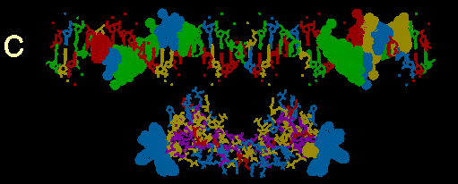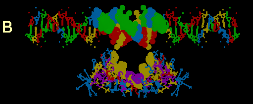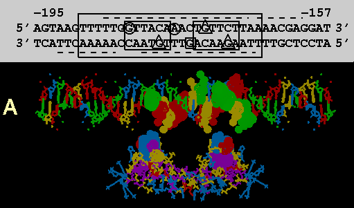 Computer models of the GR DBD from NMR structure determination with putative flanking alpha helices attached docked at a 39bp sequence of MMTPRGR1. A composite of amino acid and codon alignments from figure 2c are highlighted on the protein and DNA respectively. All highlighted residues have a dot surface indicating the van der Waals surfaces of each atom in that residue. The DNA nucleotides are color coded: Ade = green, Thy = red, Gua = yellow and Cyt = blue. Color coding of amino acids is based on polarity: positively charged side chains = blue, negatively charged side chains = red, uncharged polar side chains = yellow and nonpolar side chains = purple. The protein is docked at a distance of about 10 angstroms from the DNA for visual clarity. Above the DNA model in figure 3a, is a schematic of the DNA sequence. Boxes and underlines/overlines are as in figure 2b. Methylation inhibition studies by others (14) are summarized withthe following symbols: Triangles show nucleotides where methylation inhibitsreceptor binding. The circles show nucleotides which, when methylated, do not inhibit receptor binding but cannot be methylated after receptor is bound. The square shows a guanine that is hypermethylated in the presence of bound receptor