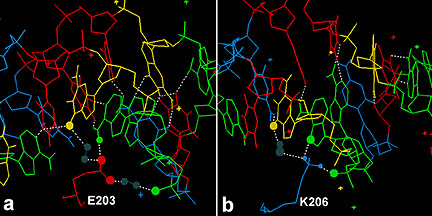 b. Direct H-bonds between amino acid K 206 and codon nucleotide A 32 at N7 base site and the O2P backbone site are shown. A water mediated hydrogen bond with codon nucleotide G 33 at the O6 Watson-Crick H-bond site is also shown.