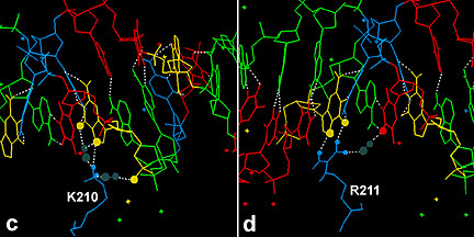 d. Direct hydrogen bonds between R 211 and its non-codon nucleotide G16 at the O6 Watson-Crick H- bond site and the N7 site. A water mediated hydrogen bond with non-codon nucleotide T34 at the O4 Watson-Crick H-bond site is also shown.