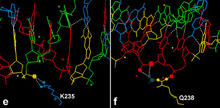 Closeup views of amino acid-nucleotide interactions between ERE nucleotides and selected ER DBD amino acids from the right monomer of the ER DBD/25 bp ERE model at various time steps during solvated molecular dynamics (see Table I). Interactions involving amino acids from the exon 2 encoded DNA recognition alpha helix and the exon 3 encoded beta strand are shown. Atoms on amino acids, nucleotides, and water molecules which form direct and water mediated DNA/protein H-bonds are highlighted with VDW surfaces. Hydrogen bonds are indicated with white dashed lines. Water molecules are colored blue-gray; amino acids and nucleotides are colored as described in figure 3.
